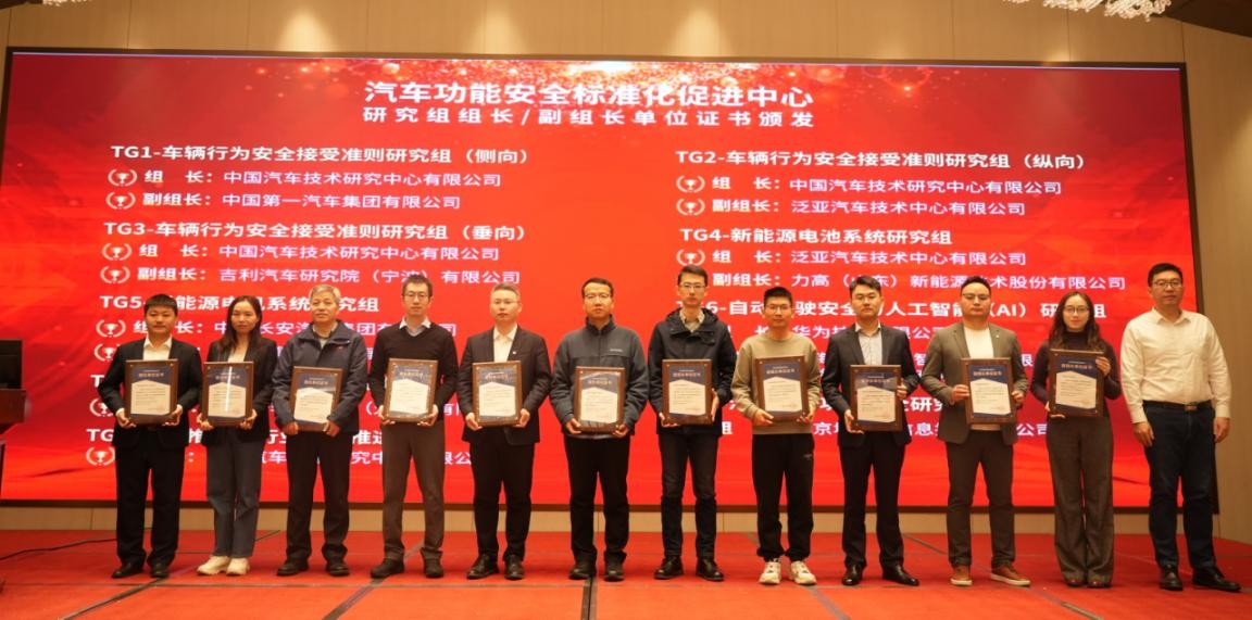 汽車功能安全中心根據(jù)前期工作情況及實(shí)際工作需要,設(shè)立了TG1-TG9研究組的組長/副組長單位,負(fù)責(zé)組織研究方案的討論、制定和實(shí)施。會議期間,舉行了TG1-TG9研究組的組長/副組長單位證書頒發(fā)儀式。