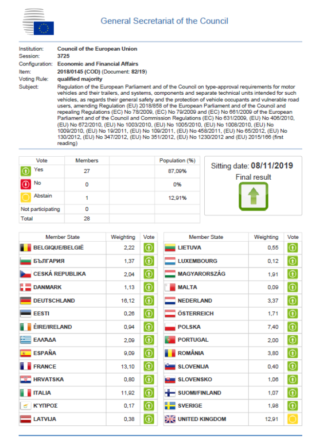 此次投票表決的完成,意味著歐盟政府(議會及理事會)已履行完成全部的法規(guī)審議程序,不久即將正式批準發(fā)布該法規(guī)。該法規(guī)作為歐盟議會及理事會法規(guī)(EC) 661/2009新的替代法規(guī),是歐盟汽車技術(shù)法規(guī)體系中極為重要的安全框架性技術(shù)法規(guī),它規(guī)定了未來歐盟市場將強制實施的一大批先進的汽車安全和駕駛輔助技術(shù)和裝置,諸如:緊急制動、車道保持、盲區(qū)監(jiān)測、酒精鎖、駕駛員疲勞和注意力探測系統(tǒng)、EDR、智能車速輔助系統(tǒng)、對行人和自行車騎行者的探測和保護系統(tǒng)等,同時新法規(guī)撤銷了與框架性技術(shù)法規(guī)相配套的原有一大批歐盟單項汽車安全技術(shù)法規(guī),它的出臺勢必對歐盟汽車市場以及全球其它市場造成巨大的影響。