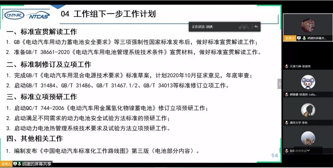 2020年4月29日,電動(dòng)汽車用動(dòng)力蓄電池標(biāo)準(zhǔn)研究工作組二屆十四次工作會(huì)議以視頻會(huì)議形式召開,來(lái)自國(guó)內(nèi)外電動(dòng)汽車整車、動(dòng)力電池、檢測(cè)機(jī)構(gòu)、高校及科研院所等單位的200多位專家代表參加了本次會(huì)議,中國(guó)汽車技術(shù)研究中心有限公司標(biāo)準(zhǔn)化研究所總工程師劉桂彬和標(biāo)準(zhǔn)法規(guī)研究四室主任鄭天雷出席會(huì)議。