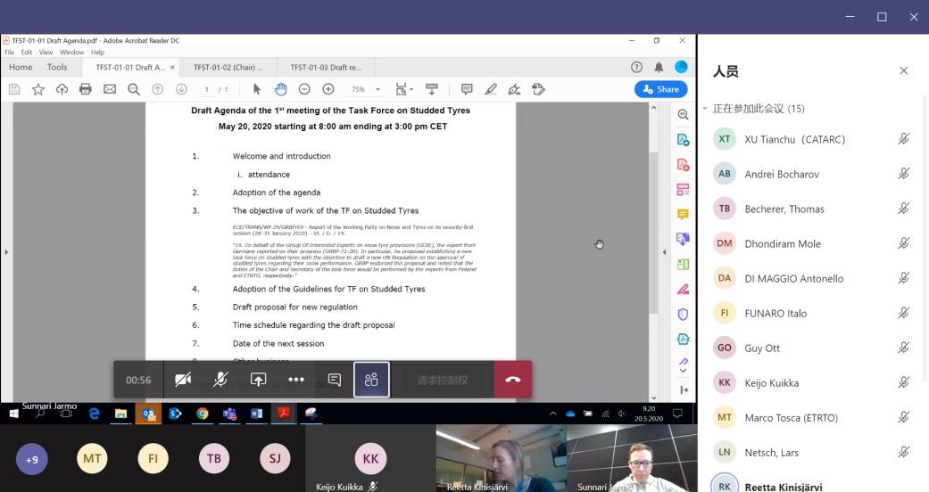 2020年5月20日,聯(lián)合國(guó)WP.29噪聲與輪胎工作組(GRBP)下屬的鑲釘輪胎專項(xiàng)組(TFST)第1次會(huì)議(網(wǎng)絡(luò)會(huì)議)召開(kāi)。來(lái)自中國(guó)、芬蘭、俄羅斯、德國(guó)、日本和歐盟委員會(huì)(European Commission)等WP.29締約方政府及相關(guān)機(jī)構(gòu),以及歐洲輪胎翻新制造商協(xié)會(huì)(BIPAVER)、歐洲輪胎輪輞技術(shù)組織(ETRTO)、日本汽車輪胎協(xié)會(huì)(JATMA)等國(guó)際組織的19名代表參加了會(huì)議。本次會(huì)議由專項(xiàng)組主席、來(lái)自芬蘭的Reetta Kinisjärvi主持,來(lái)自ETRTO的Jarmo Sunnari擔(dān)任專項(xiàng)組及本次會(huì)議的秘書。中國(guó)汽車技術(shù)研究中心有限公司許天楚和三角輪胎股份有限公司王曉東代表中國(guó)參加了本次會(huì)議。