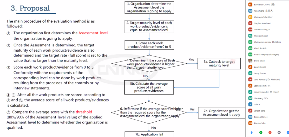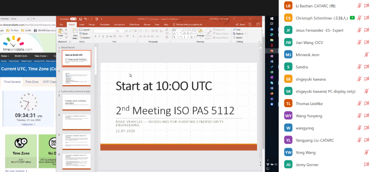 2020年7月20日~21日,國際標(biāo)準(zhǔn)化組織道路車輛委員會(huì)信息安全工作組(ISO/TC22/SC32/WG11)通過線上會(huì)議形式召開了ISO PAS 5112 Road vehicles—Guidelines for auditing cybersecurity engineering(道路車輛-信息安全工程審核指南)工作組第二次會(huì)議。來自中國、德國、日本、美國等40余名成員共同參加了本次會(huì)議,中國汽車技術(shù)研究中心有限公司的李寶田、張亞楠、劉洋洋;華為技術(shù)有限公司的王勇;國汽(北京)智能網(wǎng)聯(lián)汽車研究院有限公司的王建;北京航空航天大學(xué)的曹耀光等6人代表中國參會(huì)。