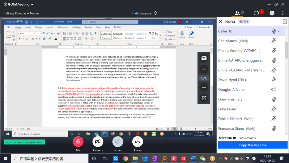 北京時間2020年9月24日至9月29日,聯(lián)合國WP.29 汽車事件數(shù)據(jù)記錄系統(tǒng)(EDR)國際法規(guī)起草組第二次系列會議以網(wǎng)絡形式召開,主要圍繞數(shù)據(jù)元素和術語定義等內(nèi)容展開討論。來自中國、荷蘭、日本、美國、德國、法國、英國、韓國等WP.29締約方政府和歐盟委員會(European Commission,EC)的專家以及國際汽車制造商組織(OICA)、歐洲汽車零部件供應商聯(lián)合會(CLEPA)、國際汽車檢測協(xié)會(CITA)等組織的專家參加會議。中國汽車技術研究中心有限公司孫枝鵬、吳含冰、張廣秀、鄭英東、馬汶鍇、常晏寧,吉利汽車研究院(寧波)有限公司佟洋,上海汽車集團股份有限公司武學輝,司法鑒定科學研究院馮浩、潘少猷等代表中國參會。