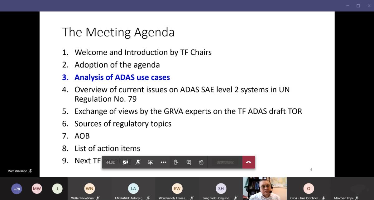 聯(lián)合國世界車輛法規(guī)協(xié)調(diào)論壇自動駕駛與網(wǎng)聯(lián)車輛工作組(GRVA)先進駕駛輔助系統(tǒng)任務(wù)組(TF ADAS)預(yù)備會議以線上形式召開