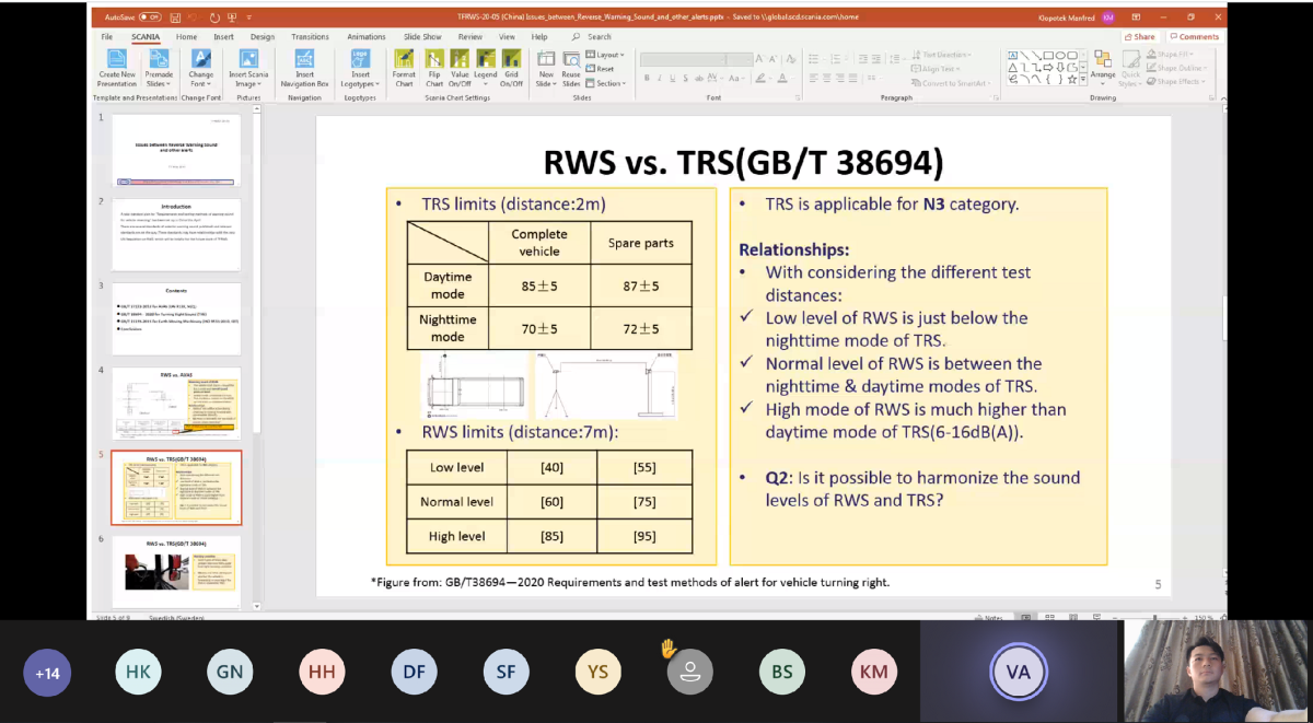 中汽中心標(biāo)準(zhǔn)所常晏寧介紹了中國關(guān)于倒車提示音與其他提示音間關(guān)系的提案(TFRWS-20-05)。提案主要對比了現(xiàn)有倒車提示音(RWS)法規(guī)草案中相關(guān)技術(shù)要求與《電動汽車低速提示音》、《車輛右轉(zhuǎn)彎提示音要求及試驗方法》、《土方機(jī)械行車聲響報警裝置和前方喇叭試驗方法和性能準(zhǔn)則》等標(biāo)準(zhǔn)間的聯(lián)系與區(qū)別。其中RWS和低速提示音在倒車時會存在同時開啟的情況,且兩種提示音聲音類型不同,會給其他道路使用者的判斷造成困難。提案比較了右轉(zhuǎn)彎提示音晝間模式、夜間模式和RWS高、中、低模式之間的聲壓級限值關(guān)系,中方代表建議將現(xiàn)有的RWS限值模式與右轉(zhuǎn)彎提示音相關(guān)標(biāo)準(zhǔn)相協(xié)調(diào),同時考慮某些重型商用車在右后轉(zhuǎn)彎的工況下RWS和右轉(zhuǎn)彎提示音同時工作,可能使行人難以判斷車輛意圖的情況。提案比較了土方機(jī)械報警裝置和RWS裝置對于可調(diào)提示音限值的相關(guān)規(guī)定,建議草案中關(guān)于提示音開和提示音關(guān)聲壓級的差值參考土方機(jī)械要求來制定,同時建議工作組討論開展車內(nèi)聲壓級限值研究的必要性。