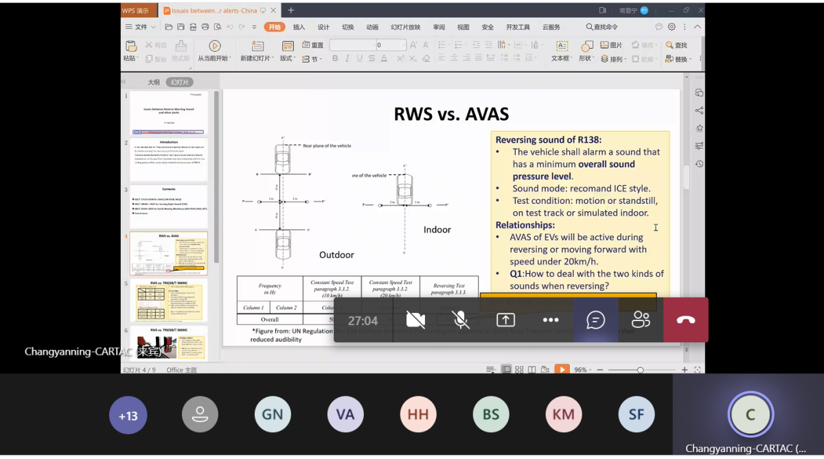 中國提案引發(fā)了工作組對RWS法規(guī)和其他車外提示音標(biāo)準(zhǔn)間沖突的討論,會議決定參考已有車外提示音法規(guī),進(jìn)一步研究RWS聲壓級限值(高、中、低模式及可調(diào)提示音裝置),中方代表進(jìn)一步建議系統(tǒng)討論車外提示音標(biāo)準(zhǔn)體系,對不同車外提示音的聲音類型、聲壓級限值進(jìn)行區(qū)分和協(xié)調(diào),減少不同種類提示音給弱勢道路使用者帶來的誤導(dǎo)。