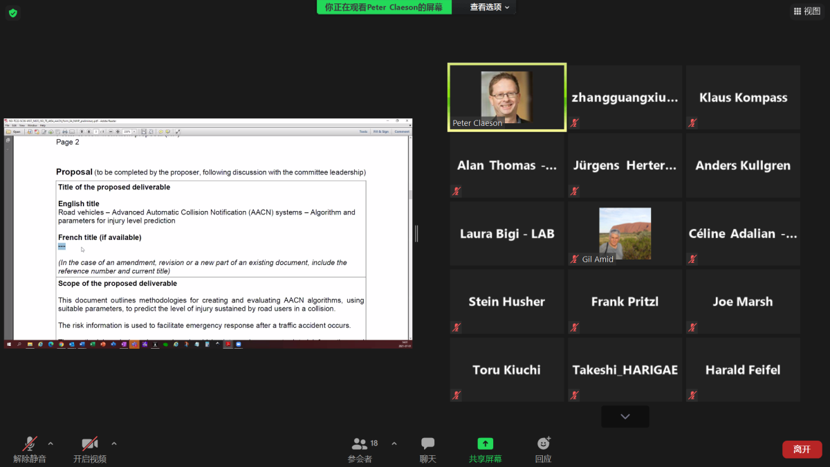 2021年7月1日,國(guó)際標(biāo)準(zhǔn)化組織道路車輛委員會(huì)安全及碰撞試驗(yàn)分技術(shù)委員會(huì)交通事故分析方法工作組(ISO/TC22/SC36/WG7)第8次會(huì)議以視頻會(huì)議形式召開(kāi)。本次會(huì)議由ISO/TC22/SC36/WG7秘書Peter Claeson先生主持,來(lái)自中國(guó)、德國(guó)、美國(guó)、瑞典、法國(guó)、英國(guó)等正式成員國(guó)的18名專家參加了此次會(huì)議。中汽中心張廣秀、林春景、常晏寧組成中國(guó)代表團(tuán)參會(huì)。
