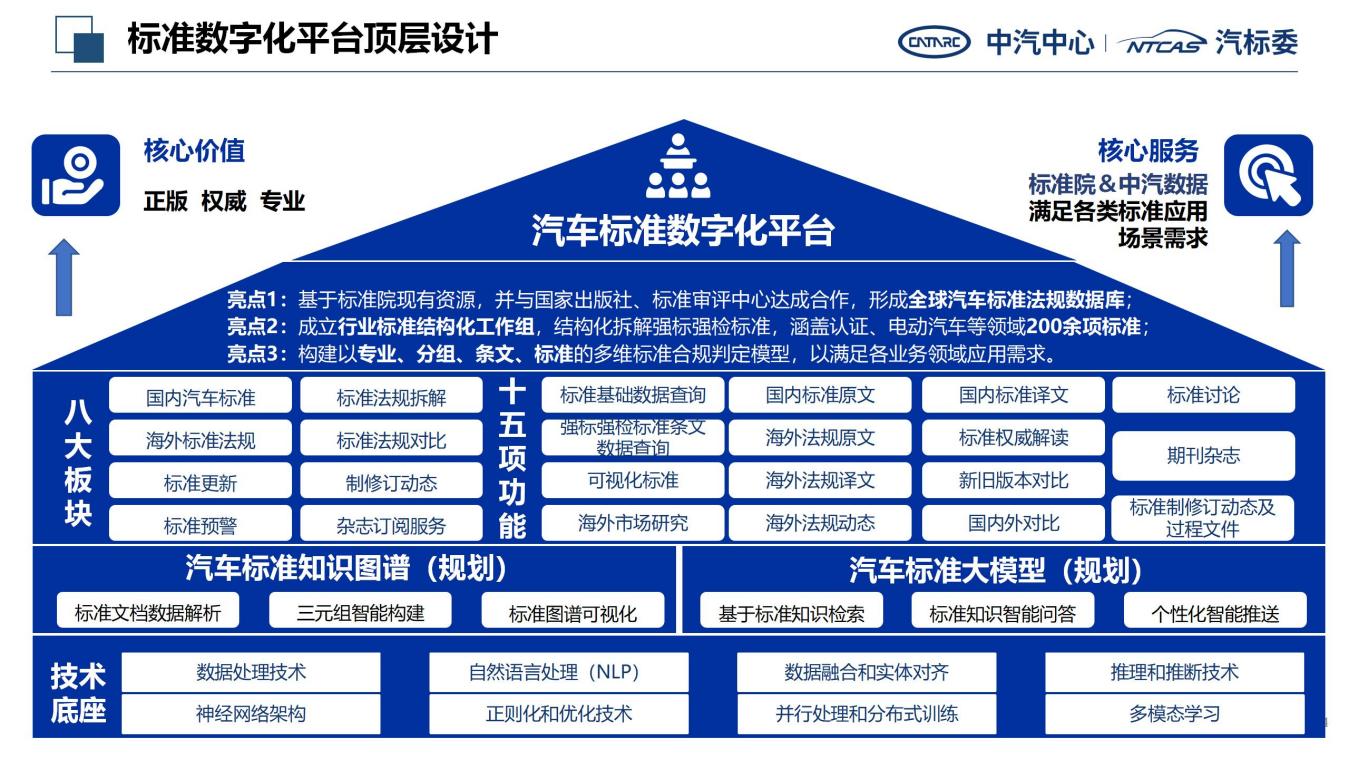 汽車標準數(shù)字化平臺以行業(yè)需求為導向,建設(shè)國內(nèi)標準和海外法規(guī)兩大資源庫,收錄7000余項汽車國家標準和行業(yè)標準數(shù)據(jù),3000余項海外法規(guī)數(shù)據(jù),并從行業(yè)使用場景上細分8個資源板塊及15項重點功能,涵蓋標準法規(guī)閱讀、譯文、拆解、比對、可視化、更新預警以及解讀等核心功能。
