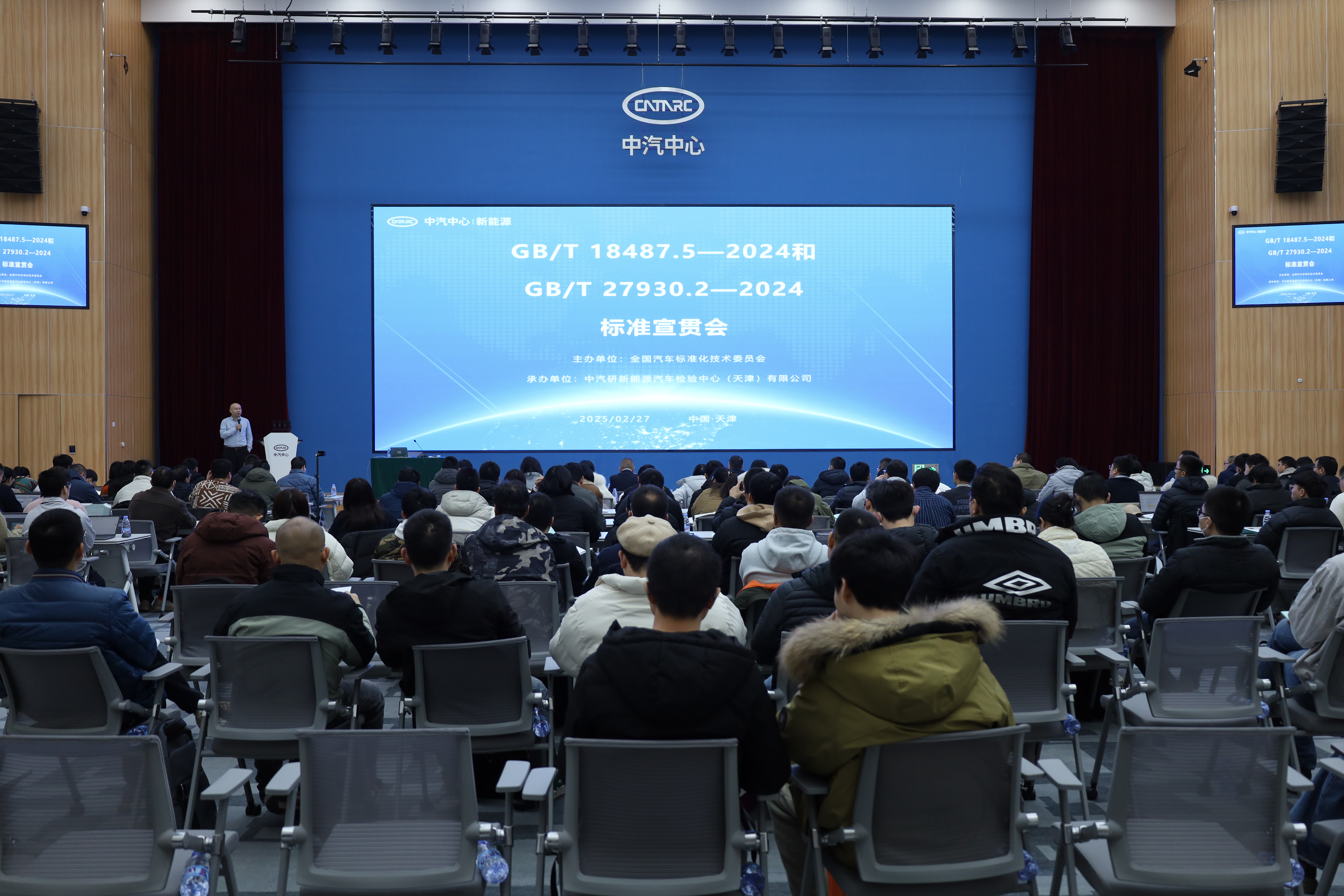 2025年2月27日,由全國汽車標(biāo)準(zhǔn)化技術(shù)委員會(huì)(以下簡稱汽標(biāo)委)主辦、中汽研新能源檢驗(yàn)中心(天津)有限公司(以下簡稱新能源檢驗(yàn)中心)承辦的GB/T 18487.5—2024和GB/T 27930.2—2024標(biāo)準(zhǔn)宣貫會(huì)在天津召開,汽標(biāo)委電動(dòng)車輛分技術(shù)委員會(huì)秘書長劉桂彬、新能源檢驗(yàn)中心總經(jīng)理高繼東出席會(huì)議并致辭,來自整車企業(yè)、充電設(shè)施企業(yè)、零部件企業(yè)、技術(shù)機(jī)構(gòu)等相關(guān)單位200余人參加會(huì)議。