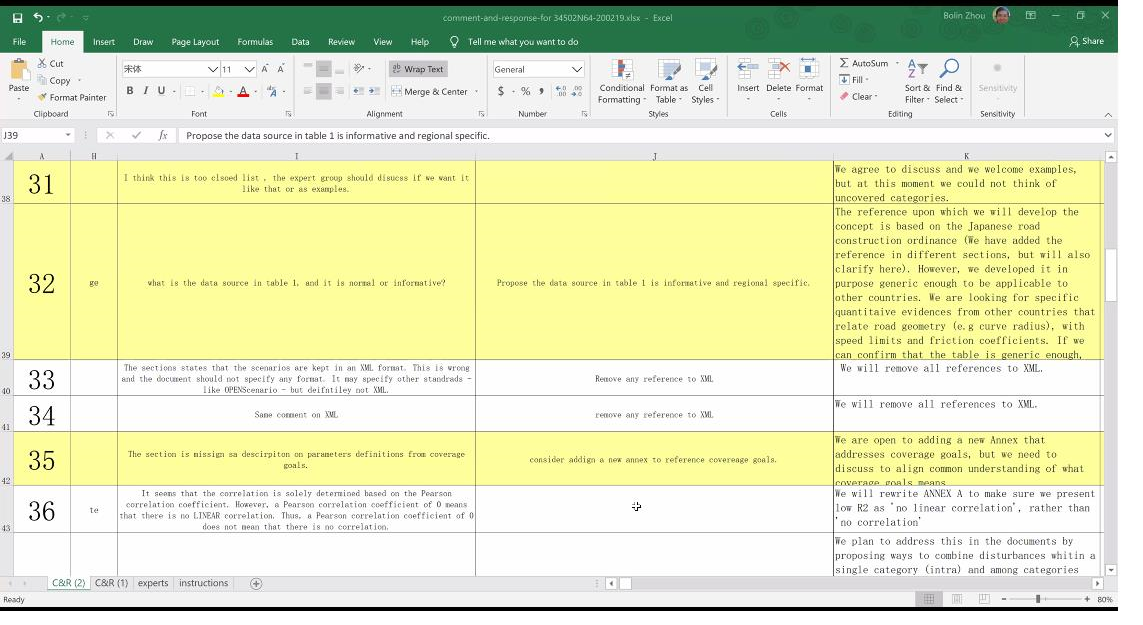 本次會議主要梳理WG9工作組現(xiàn)有各項工作情況,討論目前正在開展國際標(biāo)準(zhǔn)起草項目相關(guān)議題,針對其中重點問題探討解決方案,并制定工作組后續(xù)工作計劃。會議首先由日本專家Dr.JacoboAntona介紹“ISO34502-基于場景的自動駕駛安全評價工程框架與流程”國際標(biāo)準(zhǔn)起草情況,會議根據(jù)前期在工作組內(nèi)部收集到的草案意見逐條進(jìn)行討論,主要涉及草案中有關(guān)專業(yè)術(shù)語用詞、技術(shù)范疇界定及場景覆蓋度等問題;隨后,中國專家孫航介紹了“ISO34501-自動駕駛系統(tǒng)測試場景術(shù)語和定義”國際標(biāo)準(zhǔn)起草情況:草案根據(jù)之前會議討論結(jié)果進(jìn)行了完善,修改了部分關(guān)鍵性術(shù)語,并通過添加示例和注釋等形式闡明相關(guān)術(shù)語之間的關(guān)系,會議對該草案進(jìn)行了初步討論并給出了修改意見,其他修改意見將于3月中旬之前完成反饋;最后,會議還對ISO34503、ISO34504等兩項標(biāo)準(zhǔn)的制定情況進(jìn)行了匯報。